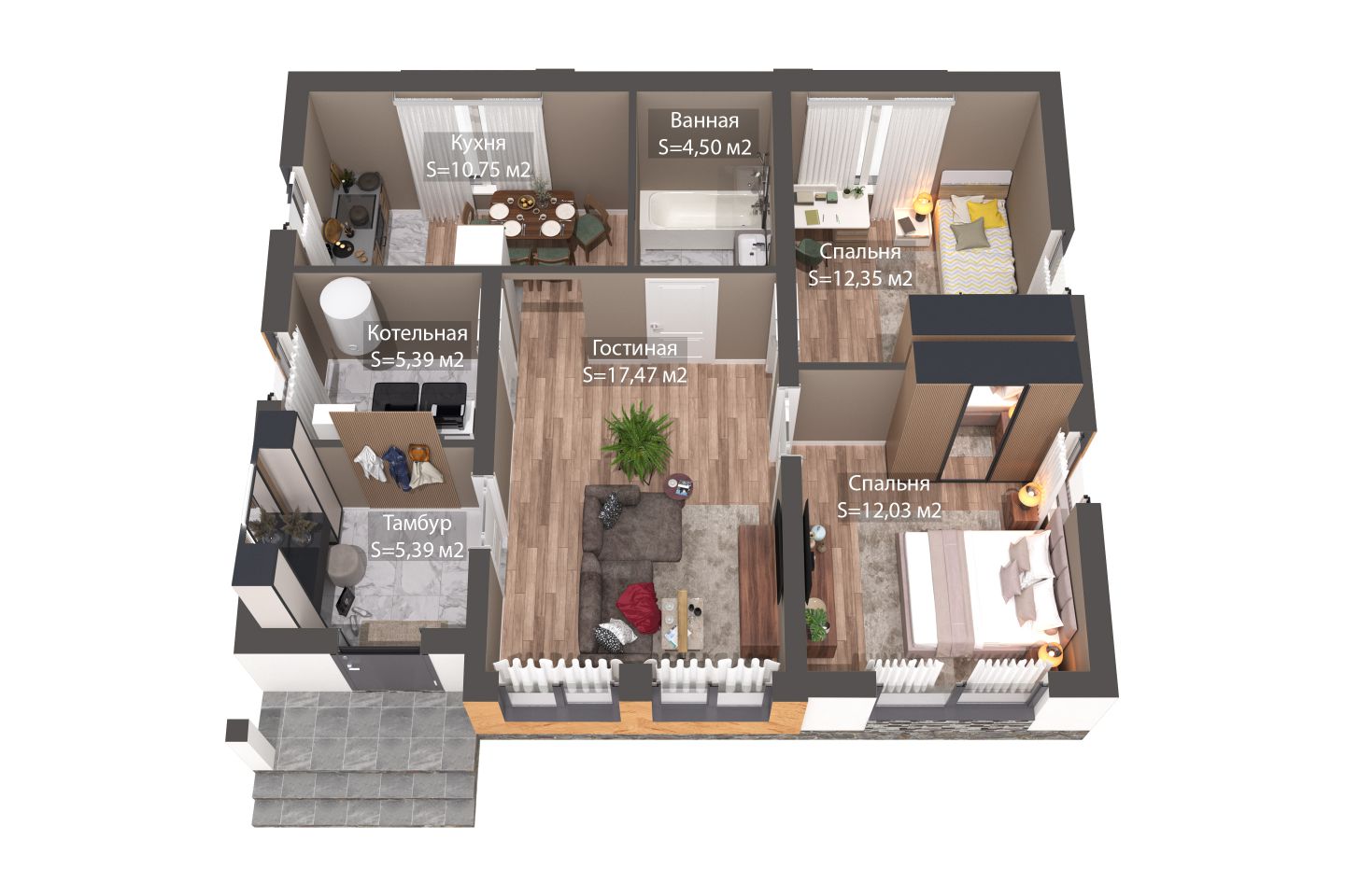 Центр дома — просторная гостиная с панорамным остеклением и вторым светом. Из неё открывается доступ в отдельную кухню, две спальни, ванную комнату и котельную.