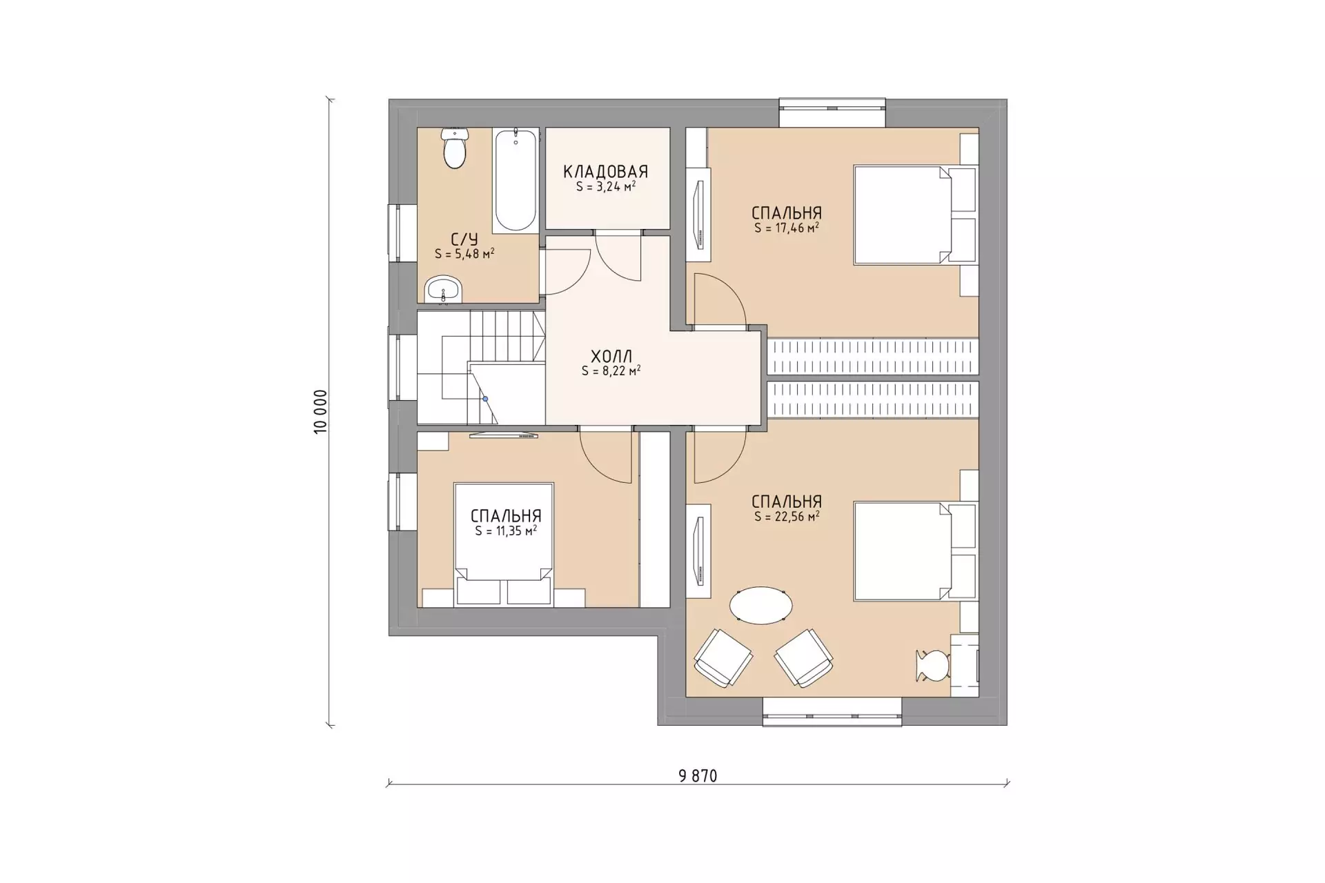 Проект «Белла» привлекает внимание за счет интересного архитектурного решения, в котором доминантой первого этажа стала большая кухня-гостиная с примыкающей террасой. Рядом с гостиной расположена изолированная комната, а напротив - большая гардеробная. На втором этаже размещаются три спальни, две из которых оснащены отдельными гардеробными. Ванная комната есть на каждом этаже. Проект будет удобен для семьи с детьми, где для каждого продумано удобное личное пространство.