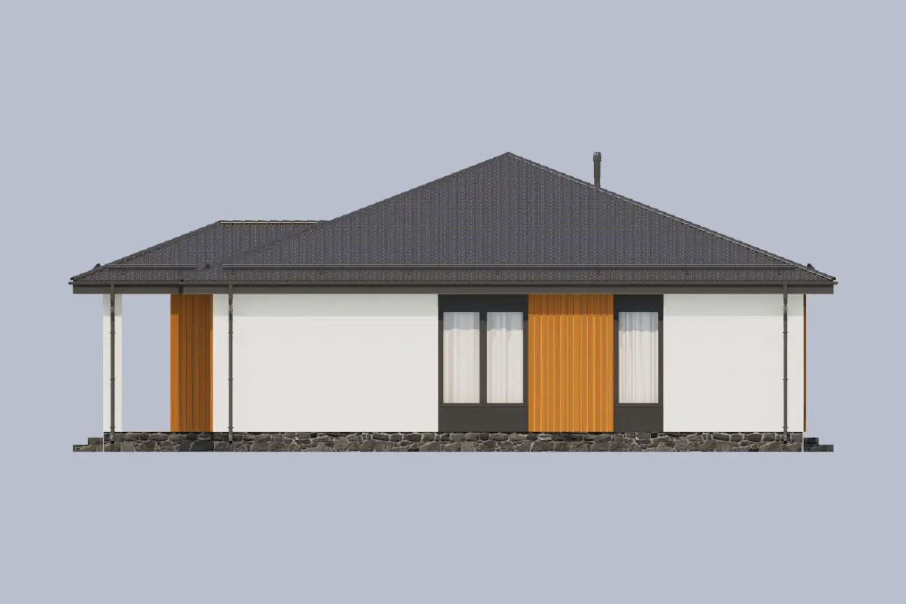 Внутреннее пространство дома продумано до мелочей. В проекте предусмотрена большая кухня-гостиная для приятного проведения вечеров в кругу семьи и близких, из которой можно попасть на просторную террасу. Рядом расположились несколько технических помещений и общая ванная. Приватная часть состоит из двух комнат и хозяйской мастер-спальни с отдельным санузлом.